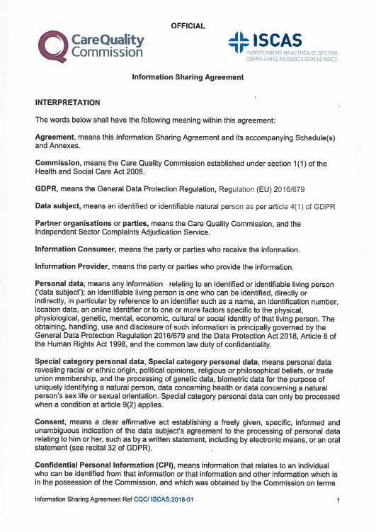 ISCAS and the Care Quality Commission (CQC) have an agreement to share appropriate information for reasons of public interest, in order to ensure high standards of quality and safety of health care. The information sharing agreement sets out the basis for sharing information and the governance around information. More information can also be found in our Privacy Policy.